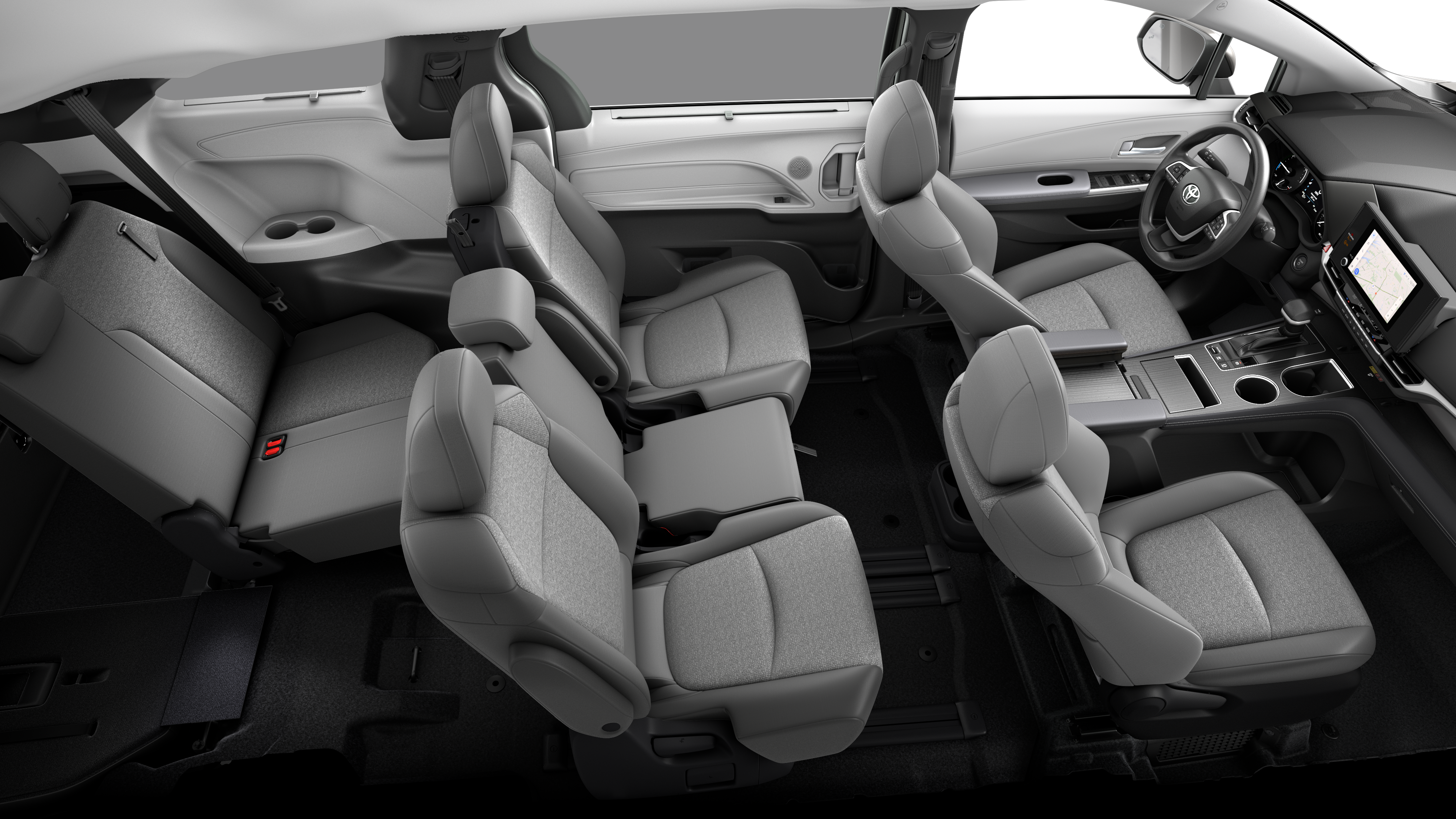 - Fixed center console, pass-through, illuminated storage compartment, and four cup holders