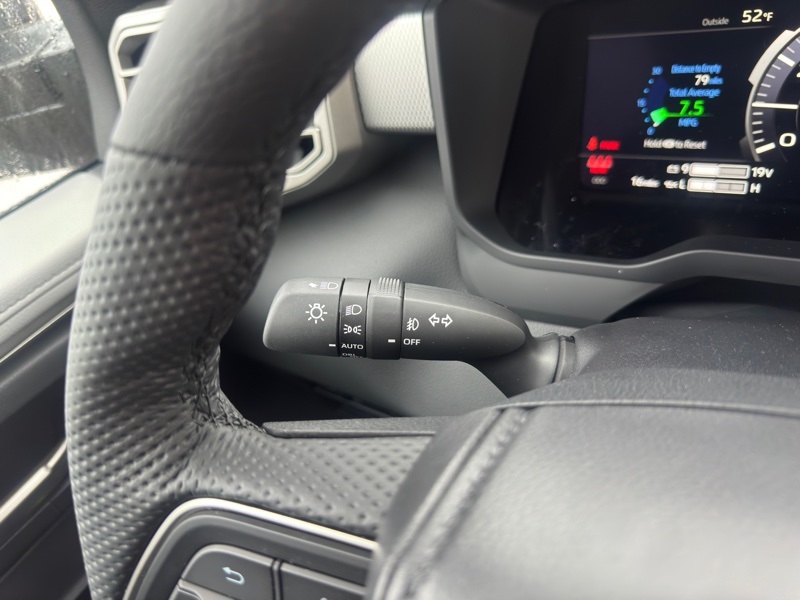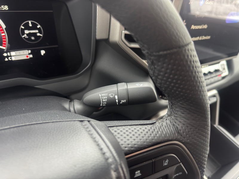 - Leather-wrapped manual tilt/telescopic steering wheel with phone, audio, display/infotainment, and Driver Assist controls