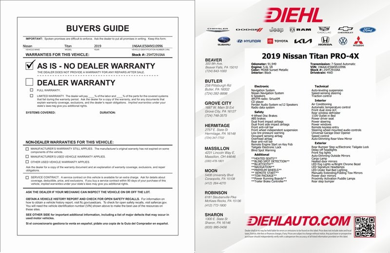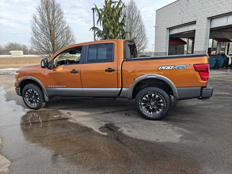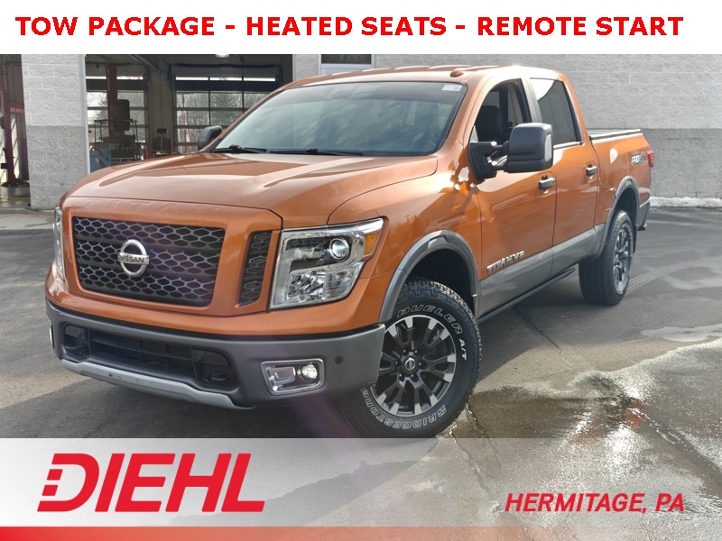**HEATED SEATS**, **BLIND SPOT DETECTION**, **BLUETOOTH**, **NAVIGATION**, **PREMIUM WHEELS**, ** REMOTE START**, **TOW PACKAGE**, **Power Running Boards**, **Trailer Brake Controller**, Titan PRO-4X, 4D Crew Cab, 4WD, 110V Outlet in Bed, 4-Way Power Assist Seat, 4-Wheel Disc Brakes, ABS brakes, Auto-Dimming Outside Mirrors, Auto-Dimming Rear-View Mirror, Automatic temperature control, Blind Spot Warning, Cargo Lamp, Delay-off headlights, Fender Audio System w/12 Speakers, Front & Rear Parking Sensors, Front dual zone A/C, Heated Power Tilt/Telescopic Steering Wheel, Leather Seat Trim, LED Signature Headlamps, LED Under Rail Bed Lighting, Low tire pressure warning, Manually Extending/Folding Tow Mirrors, Memory Driver Seat w/Auto Entry/Exit Feature, Navigation System, NissanConnect featuring Apple CarPlay and Android Auto, NissanConnect Services Powered By SiriusXM, Power driver seat, Power Sliding Rear Window w/Defogger, PRO-4X Badged Floor Mats, PRO-4X Convenience Package, PRO-4X Utility Package, Proximity Activation Puddle Lamps, Rain sensing wipers, Rear Under Seat Storage, Rear Utility Bed Step, Remote Engine Start on Key Fob, Steering wheel mounted audio controls, Tailgate Area Illumination, Tailgate Electronic Lock, Telescoping steering wheel, Tilt steering wheel, Trailer Brake Controller, Universal Garage Door Opener, Utilitrack System w/4 Tie-Down Cleats.