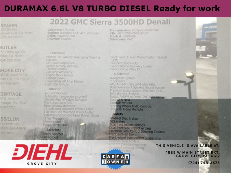 Cayenne Red 2022 GMC Sierra 3500HD Denali 4D Crew Cab 4WD Duramax 6.6L V8 Turbodiesel 10-Speed Automatic