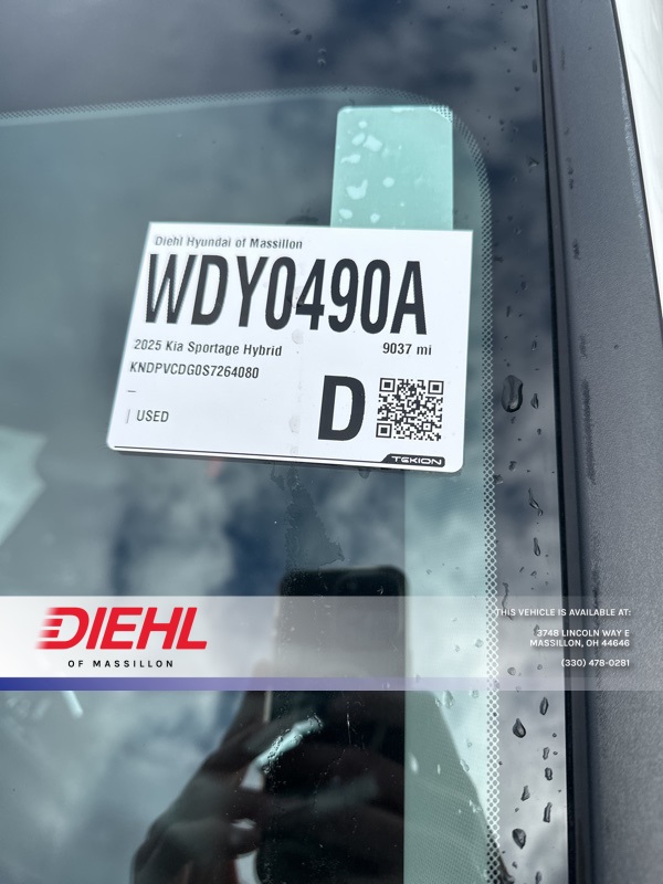 **One Owner**, **Clean Carfax**, **All Wheel Drive**, **Android Auto/Apple Carplay**, **Backup Camera**, **Blind Spot Detection**, **Bluetooth**, **Heated Seats**, **Lane Keep Assist**, **Navigation**, **Remote Start**, Wireless Charging Pad, I4. Recent Arrival! 2025 Kia Sportage Hybrid EX